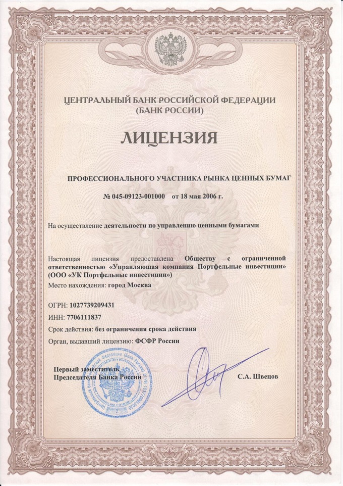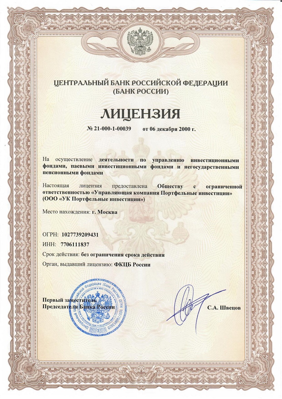ООО «УК Портфельные инвестиции» зарегистрировано 28 февраля 1996 года и имеет лицензию ФКЦБ России №21-000-1-00039 от 06 декабря 2000 года на осуществление деятельности по управлению инвестиционными фондами, паевыми инвестиционными фондами и негосударственными пенсионными фондами и лицензию ФСФР России №045-09123-001000 от 18 мая 2006 года на осуществление деятельности по управлению ценными бумагами.